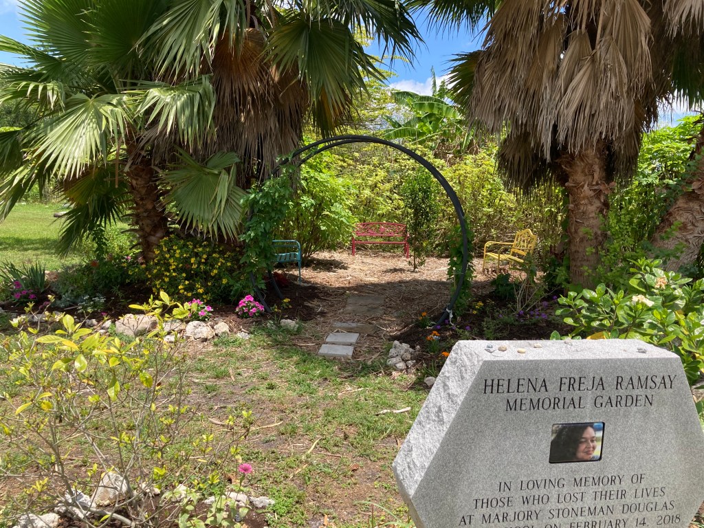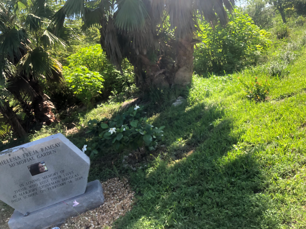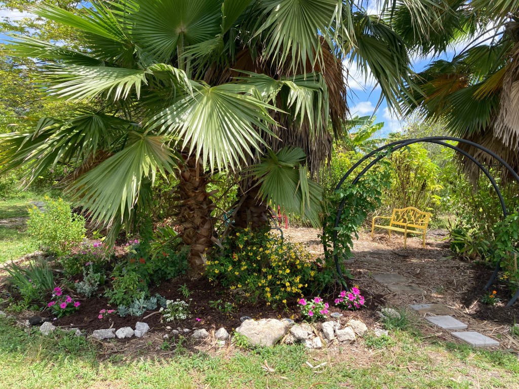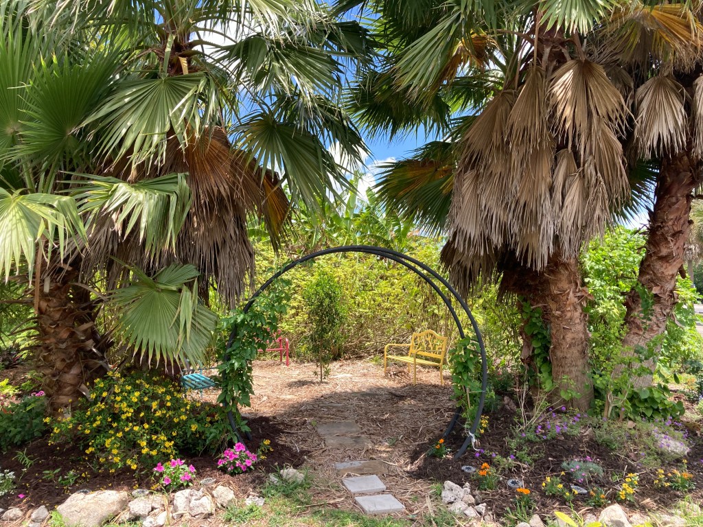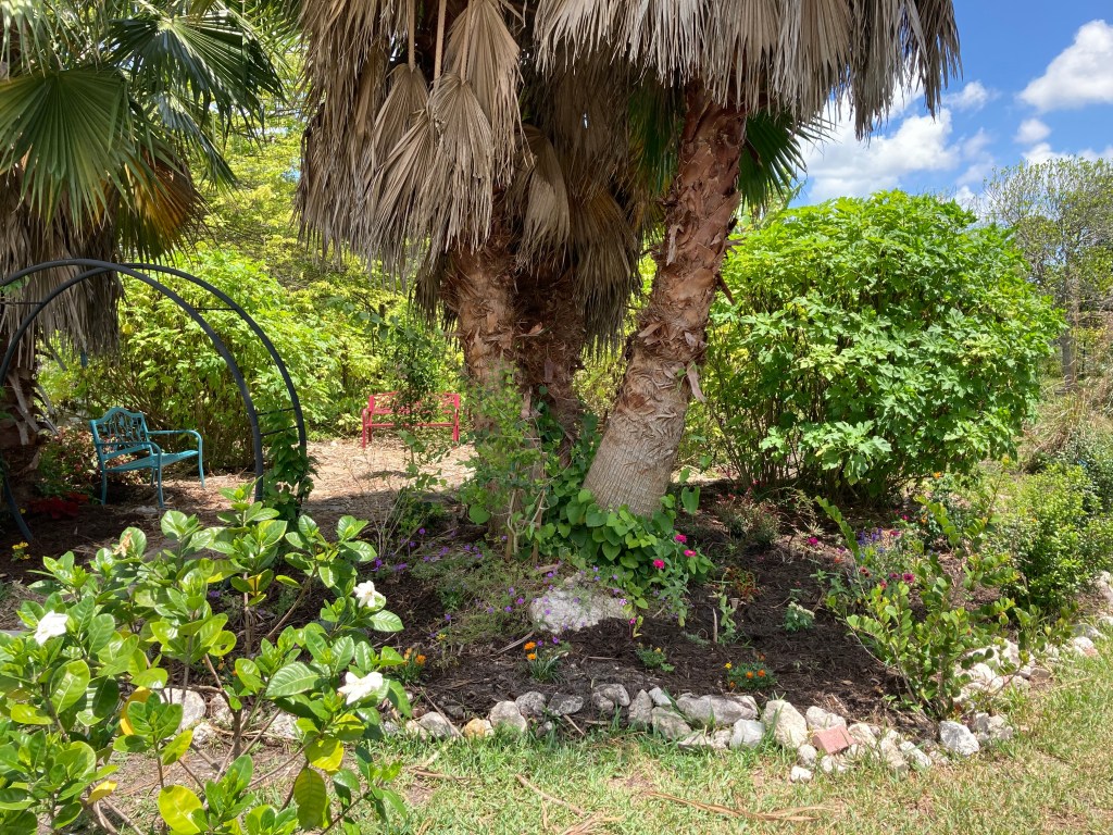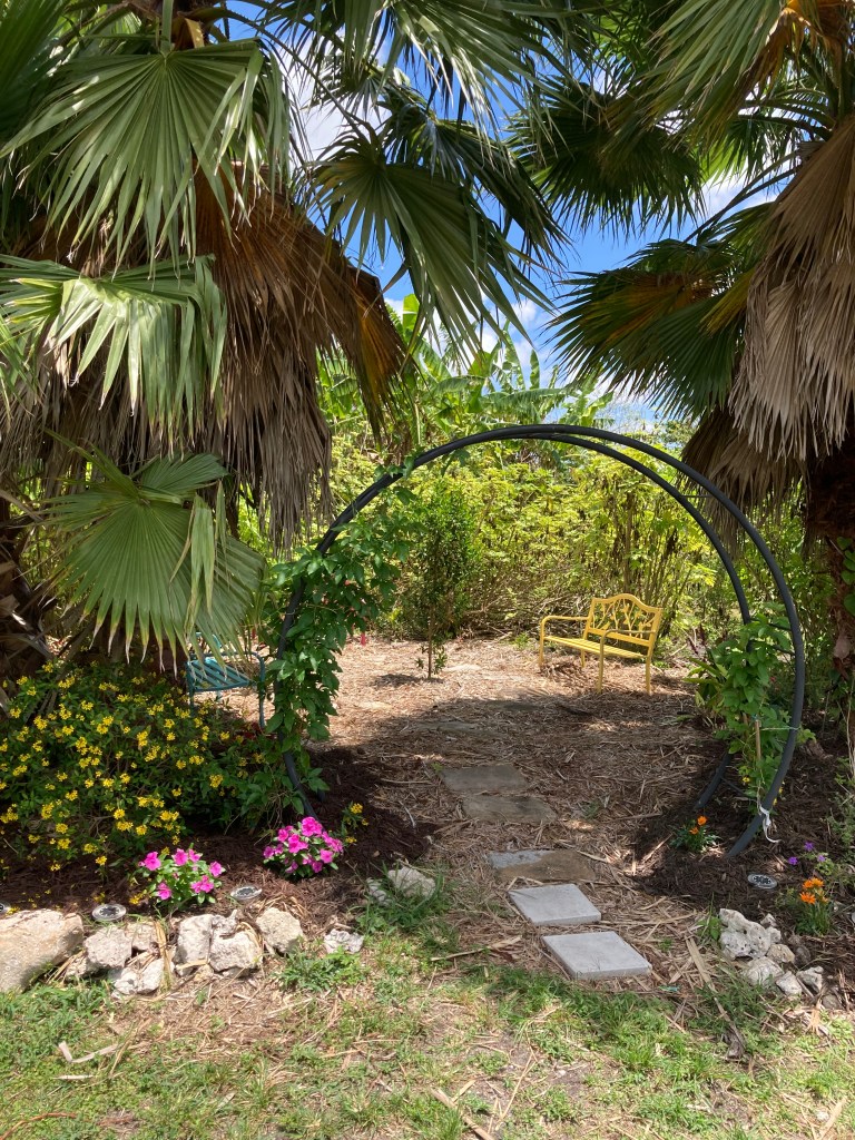 A beautiful spot has been created in the Helena Ramsey Memorial Garden which is part of the Rotary Coral Springs Community Garden and Food Forest. One of our gardeners, Debbie Wenger, saw an area that she believed would be an ideal spot for visitors to feel the peace of the garden. After discussing the idea with other members, she applied for and received grant money in May 2021. It was called the Pollinator Project and $1000 was used to purchase soil and plants which were all pollinator and wildlife compatible. An incredible amount of work was required to prepare the area, cleaning out bushes and weeds, adding the soil, and finally planting. Soon, the project began to grow and a moon arch was installed and benches purchased and painted. More flowering bushes and plants have been added and the work is ongoing. Volunteers weed and water daily and the once weedy spot has turned into a beautiful oasis for people, butterflies and birds. Thank you Debbie, Satya, Judy, Susan, Anne, Bez, Eric and many others who labored to make this special grove for the community. Here are a few before and after photos.