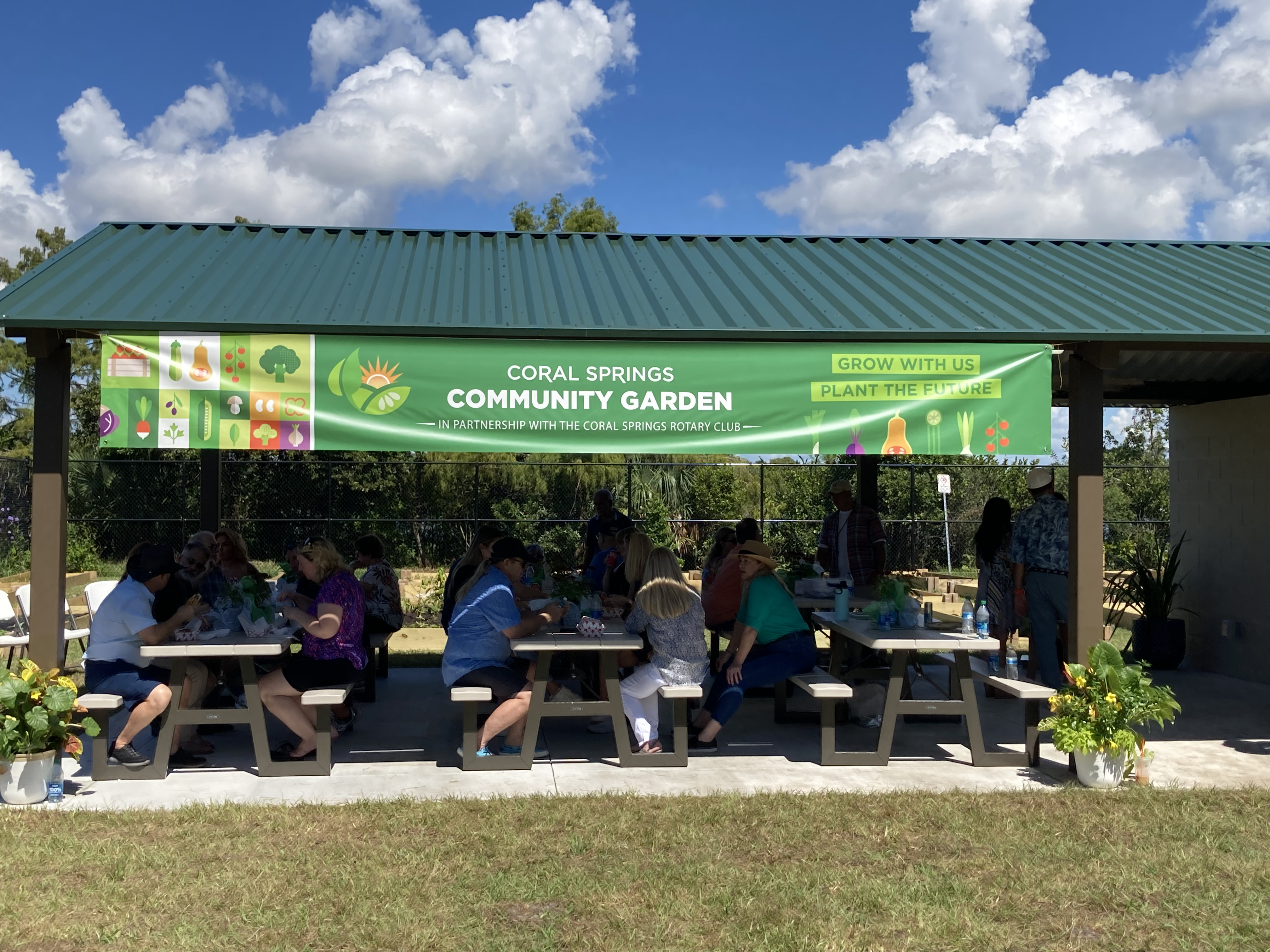 October 7th saw a wonderful turnout for the dedication of the new pavilion donated by Susan Connor in memory of her son, Kevin. Community garden members, the Coral Springs Rotary, and representatives of the city were present for the dedication. The pavilion will make it possible for education classes about gardening and information about nutrition. The expansion also adds additional garden beds for new gardeners, a space for children and more beds to grow food for donation.